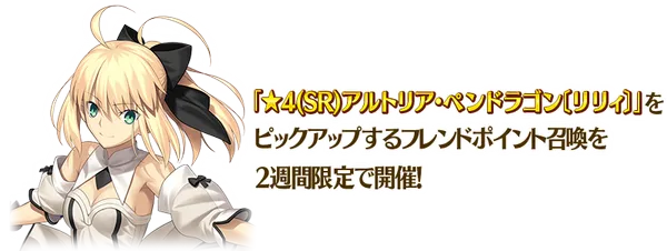 その他にも、「★4(SR)アルトリア・ペンドラゴン〔リリィ〕」をピックアップする期間限定のフレンドポイント召喚も同時開催いたします。