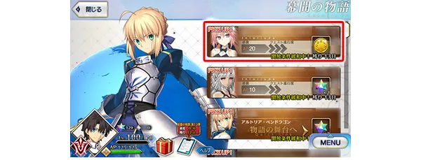 「幕間の物語」の開放条件も、通常時は対象サーヴァントの「絆Lv.」「霊基再臨段階」も条件となるところを、「特定のメインクエストのクリア」または「幕間の物語の前節のクリア」のみに緩和されます。