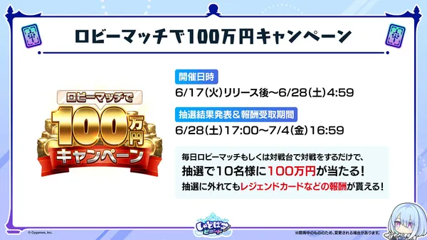 毎日「シャドバパーク」内で挑戦できるキャンペーンミッションを達成することで、抽選で10名様に100万円が当たる「ロビーマッチで100万円キャンペーン」を開催します。