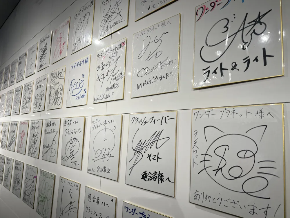 壁の一角にはユニットのボイスを担当する声優さんらのサイン色紙がズラっと並んでいました。こんなに揃うと圧巻!