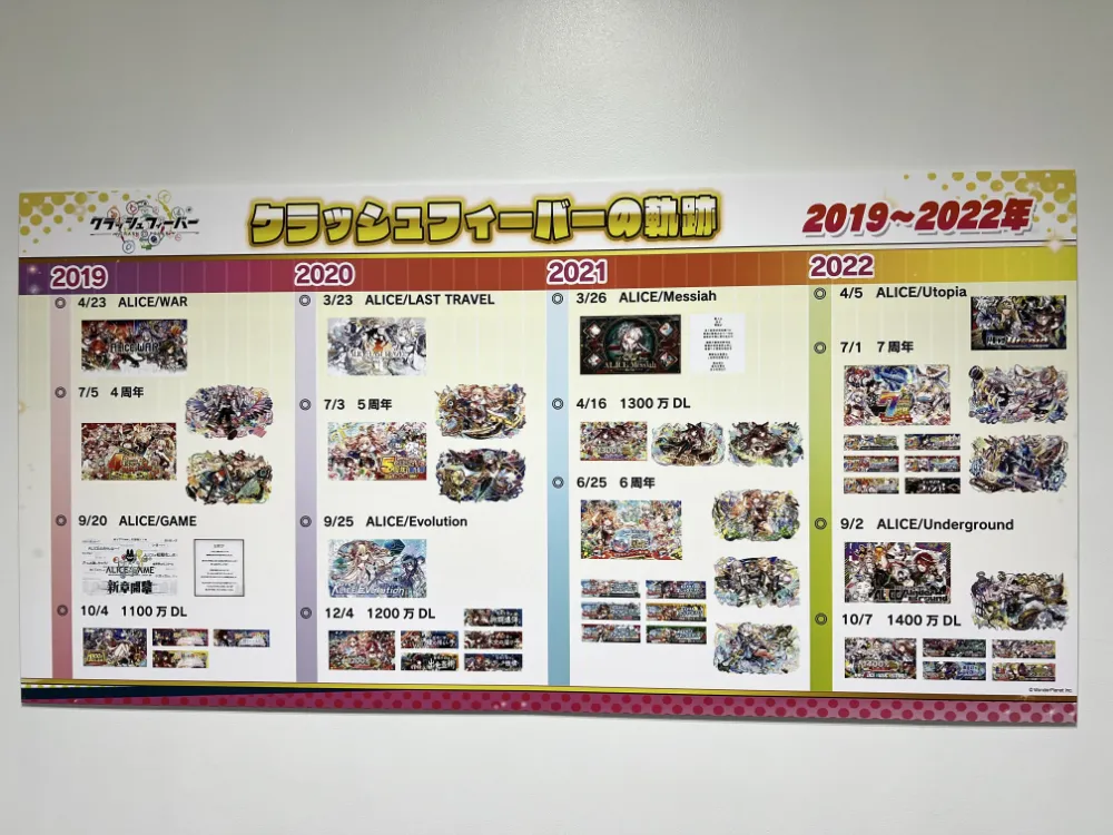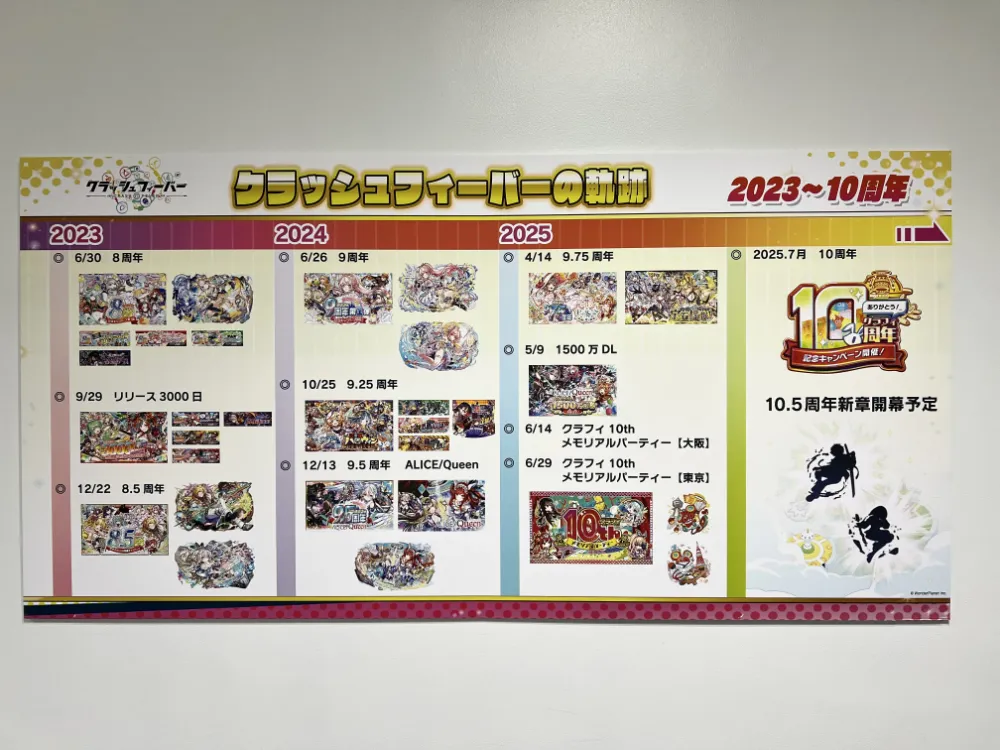 廊下にはクラフィの10年の軌跡をたどることができる年表も。2015年7月からスタートしていて、これまで進んできた物語を思い出すことができるものになっていました。「ここが好き!」や「このタイミングで始めたんだ」などの会話が聞こえてきて、とてもエモい空間…!