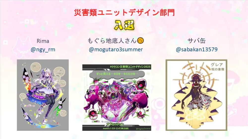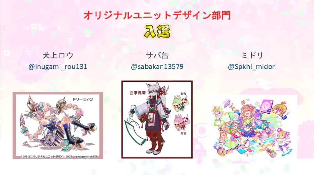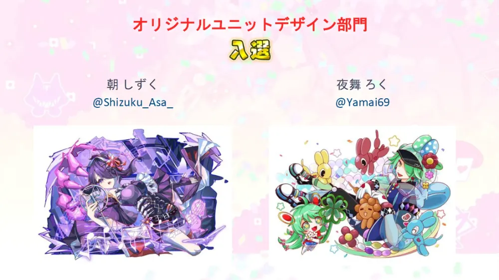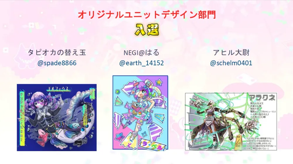 オリジナルユニットデザイン部門の最優秀賞に選出されたのは、ねのむさん!「電脳世界感や色使いが魅力的で、見やすくまとめられていて設定で鬼教官というギャップがある部分にもグッときた」との論評がなされていました!