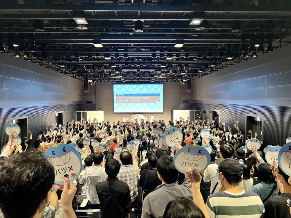 続いてのコーナー「クラフィTV〇✕QUIZ」こちらは客席全員参加型のコーナー。入場時に配られたうちわを使い参加する形式で、〇だと思ったら赤ジェリーを、✕だと思ったら青ジェリーを頭の上で掲げます。最後まで勝ち残るとオリジナルクリアファイルをゲットすることができました!