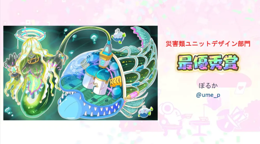 チョウチンアンコウのちょうちんが美女になっているという美しくも恐ろしいデザインで、災害類ユニットデザインへの解像度がとても高いと絶賛されていました。