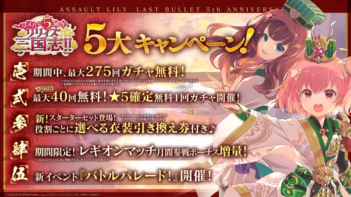 キングポーンから好評配信中の「アサルトリリィ Last Bullet(ラスバレ)」が2026年1月でリリース5周年を迎えた。本記事ではゲームの魅力をおさらいしつつ、5周年記念キャンペーンやイベントについて紹介していく。