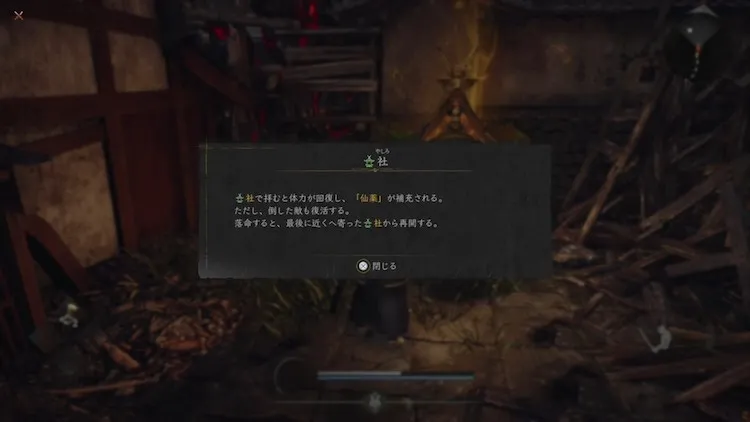 社は死んでしまった際の中継ポイントになるため、解放しながら先へ進むようにしよう。