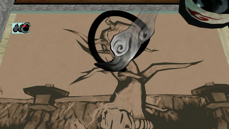 道中の木が投げてくる木の実は、一閃で跳ね返すことが可能。跳ね返すと一定時間木が動かなくなるため、その間に先に進もう。