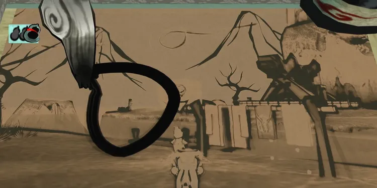 物干し竿の修復後、筆で空に丸を描き筆しらべ「光明」を発動すると洗濯物が乾く。