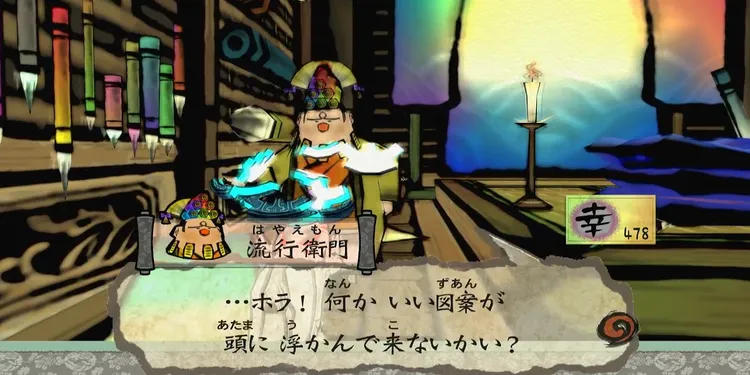 呉服屋に戻って流行衛門に話しかけ、女の子から教えてもらった模様を描く。