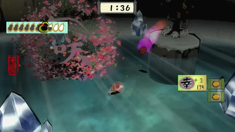 筆しらべ中も画面上部のタイマーは進んでいくが、カイポクは止まった状態になるので、被弾の危険がある氷塊や雪玉は破壊しながら進むと良い。