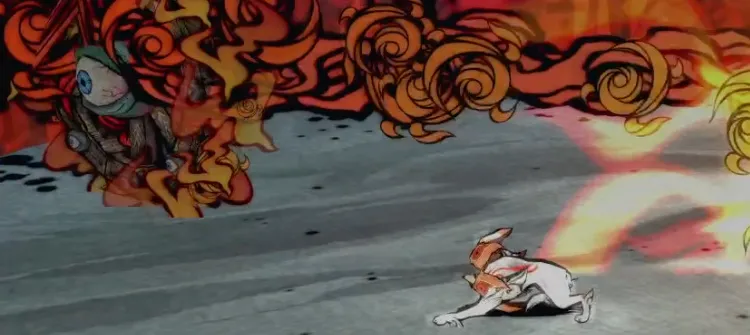 朱目輪入道が炎をまとっている状態だと攻撃が通らない。なので筆しらべ「疾風」で炎を消し飛ばすか、攻撃終了後疲れて炎が消えるタイミングを狙って攻撃しよう。