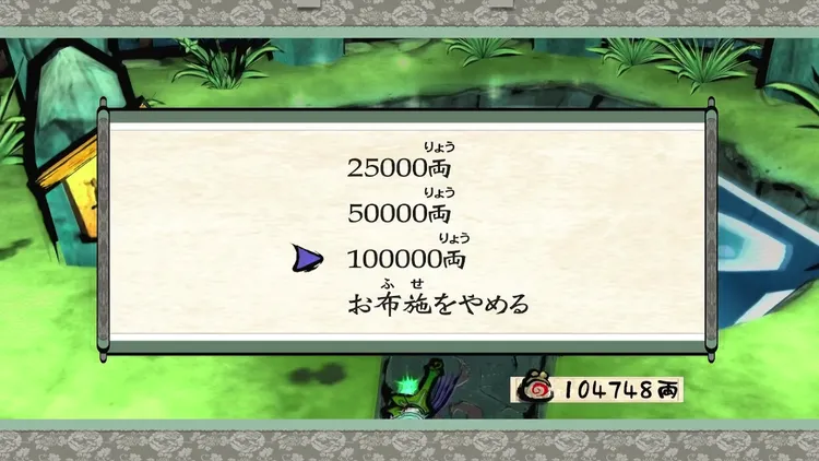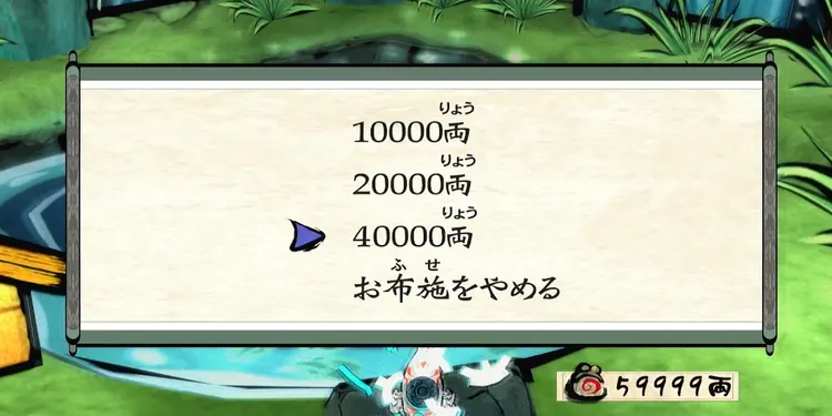 なお、お金は初期状態では99999両までしか持てないので、複数回に分けてお布施するか幸玉を使って財布の上限を上げる必要がある。