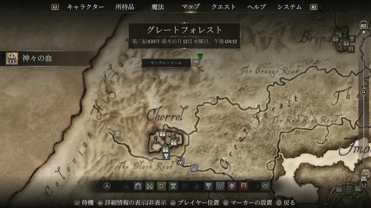 目的地マーカーを追ってサンクレ・トールに向かう。ウェノイン修道院にファストトラベルして馬で北上すると良いだろう。