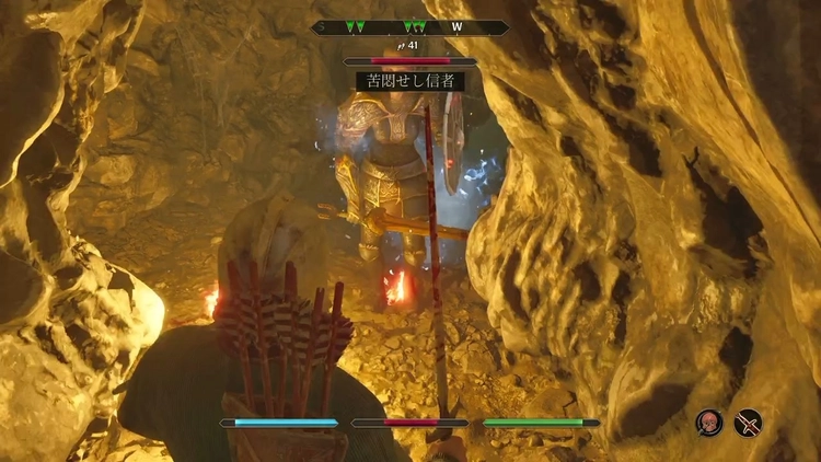 鉱山内にはワイヤーの罠が張られている。ワイヤーが切れると鉄球が飛んでくるため、足元にも注意しながら進む必要がある。