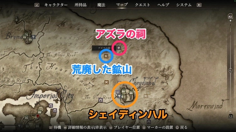アズラの祠はシェイディンハルの北側にある。クエスト中に荒廃した鉱山にも向かうため、アズラの祠へ行くついでにマッピングしておこう。