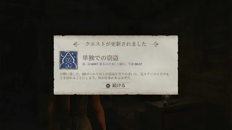 クエスト「単独での窃盗」では、任意の家から窃盗を繰り返してブルーマの宿屋「オラヴ・タップ」にいる「厭世家オンガー」に盗品を売却、合計の売却額が一定以上になることで次のクエストが発生というのが大まかな流れ。