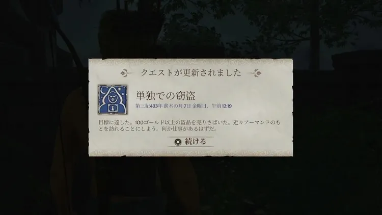 盗品商に累計600G分の盗品を売却することで、クエスト「光無き眼を向けて」の発生条件を満たす。