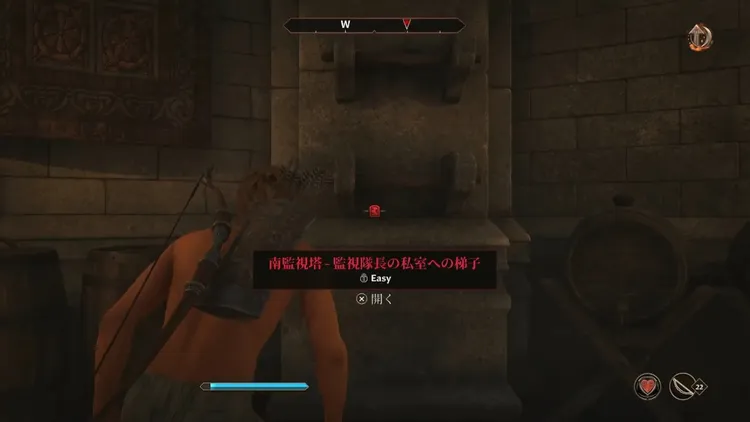 見つからないように隠密状態で梯子をのぼり続けて、監視隊長の私室まで登ろう。なお、下の階へ降りる際は、梯子ではなく落とし戸を調べることで降りることが可能。