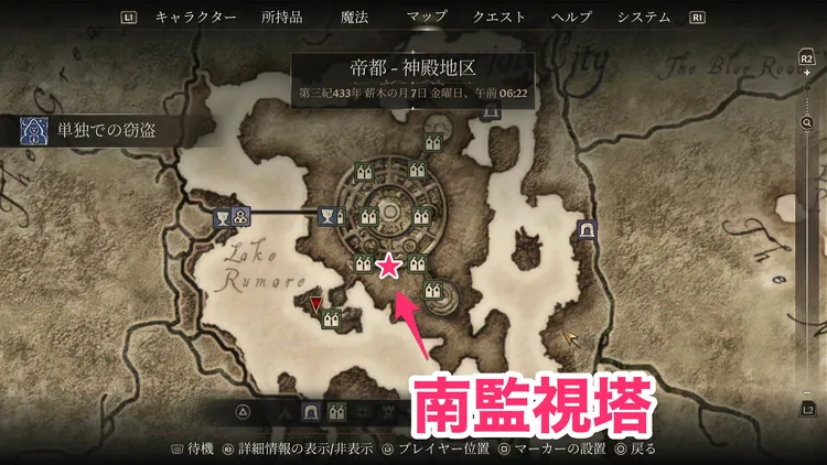 帝都の神殿地区、もしくは庭園地区から南へ進み南監視塔へ入ろう。南監視塔へ入るだけであれば不法侵入ではないため、監視兵が近くにいても慌てることはない。