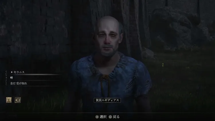 物乞いから「セラニス」の居場所についての話を聞こう。情報をもらうには、20ゴールドが必要。
