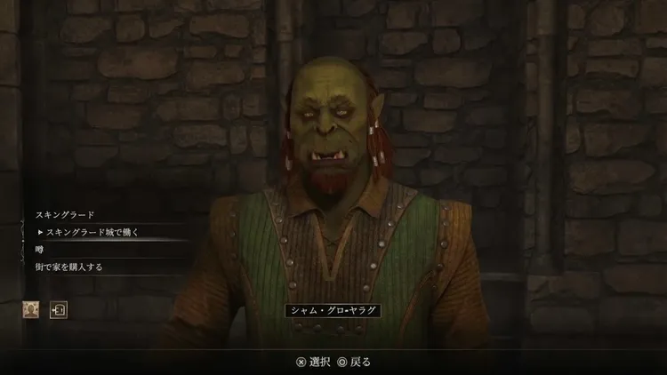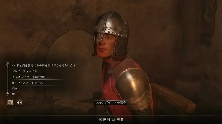 地下牢の看守は、賄賂を渡しても扉を開けてはくれない。「スキングラード城で働く」を選ぶことで、次の目的地に関する情報を得ることができる。