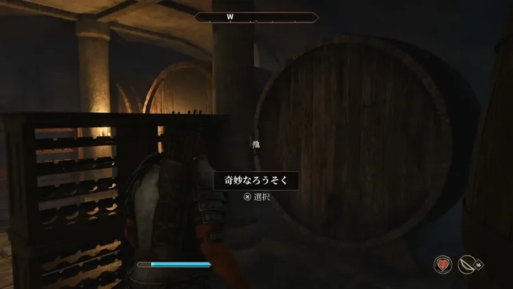 ワイン倉庫の巨大なワイン樽があるエリアにて、血が付着している「奇妙なろうそく」を調べると、隠し通路への扉を開くことができる。