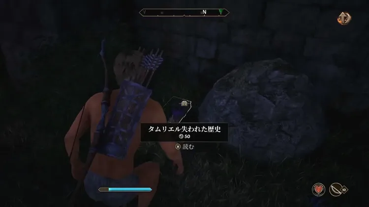 スキングラードへ戻り、マーカーの場所にある井戸付近、左側の茂みから本「タムリエル失われた歴史」を回収しよう。