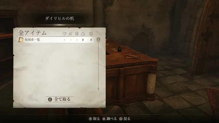ダイリヒルの部屋に到着したら、ダイリヒルの机を開錠して中から「候補者一覧」を盗もう。外へ出る際は、マーカーの場所ではなく来た道と同じ道を通って帰るのがおすすめ。