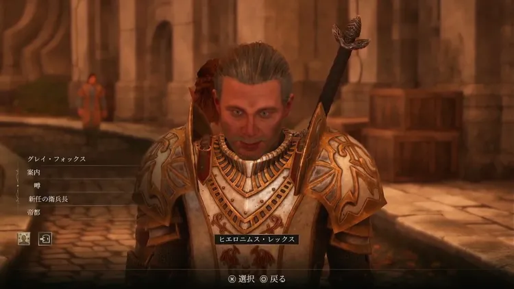 レックスと会話して「新任の衛兵長」を選択、移動命令を渡そう。波止場地区にいることが多いが、時間帯によっては別の場所にいるので、マーカーを目印にレックスを見つけよう。