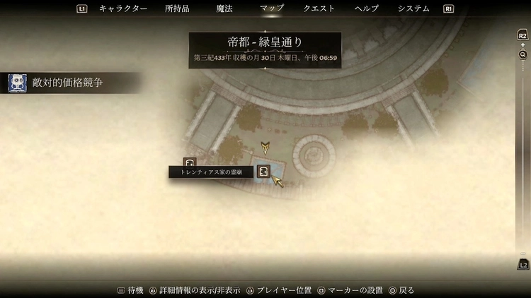 クエストマーカーに従って、帝都-緑皇通りへ移動し、トレンティアス家の霊廟へ踏み込もう。
