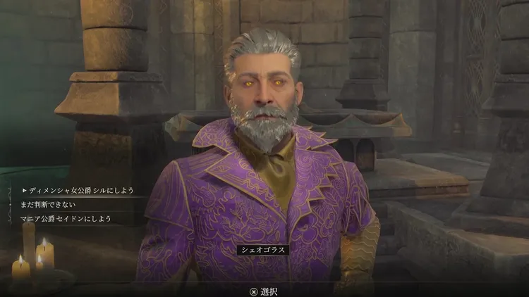 選択肢で「マニア公爵 セイドン」を選ぶとクエスト「マニアの儀式」、「ディメンシャ女公爵 シル」を選ぶとクエスト「ディメンシャの儀式」が発生する。