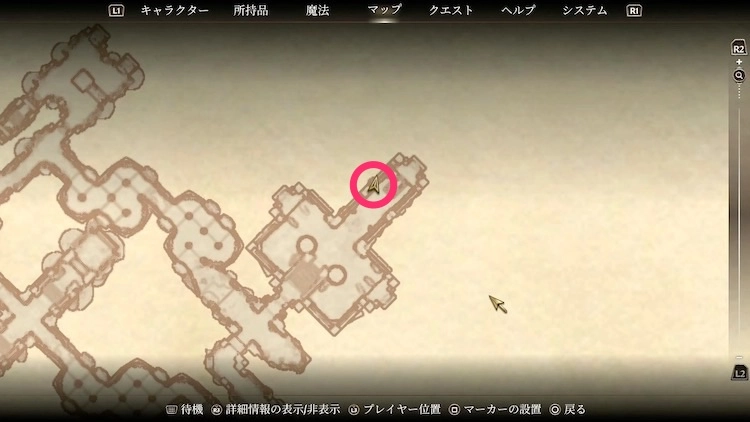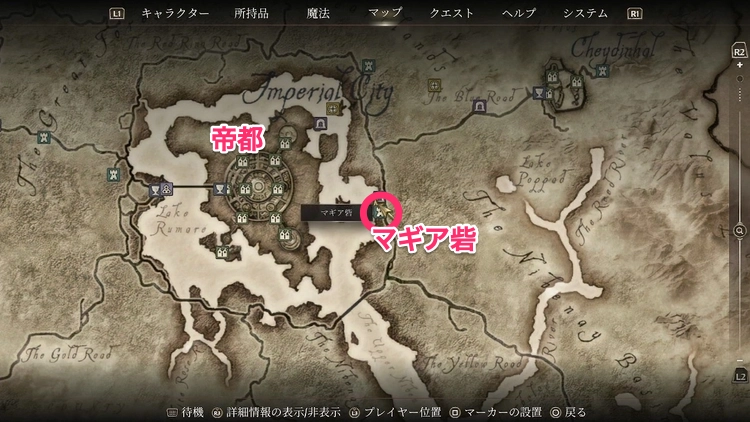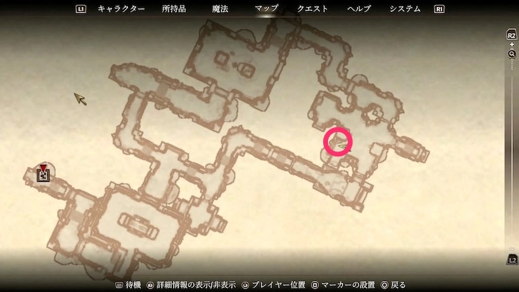 ちょうどよいファストトラベル地点がないため、初めて行く際は少し歩く必要がある。地下水道出口から川を渡り南下するのが分かりやすい。
