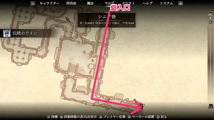 影滅のワインが入った宝箱から少し進んだ先、レバーと鉄柵がある区画で3日経過させてから引き返すことで、影滅のワインを何度でも入手できる。
