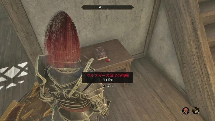 ウルフガーの家宝の指輪は、屋根裏への階段手前にある机の上の本「レヤウィン案内書」の右下にある。小さいオブジェクトなため見逃し注意。