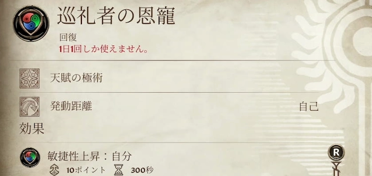 悪名が0の状態で巡礼をクリアすると、天賦の極術「巡礼者の恩寵」を修得できる。