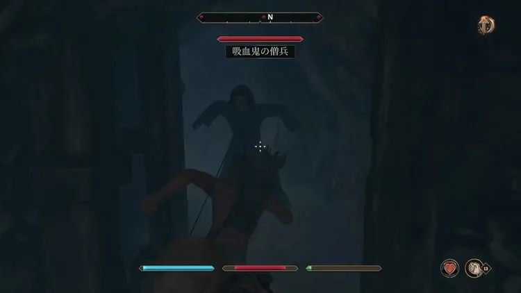 地下墓地には、吸血鬼の敵が複数出現する。吸血鬼の攻撃に被弾すると、治療が面倒な吸血症にかかってしまうため、なるべく被弾を避けて目的地まで移動しよう。