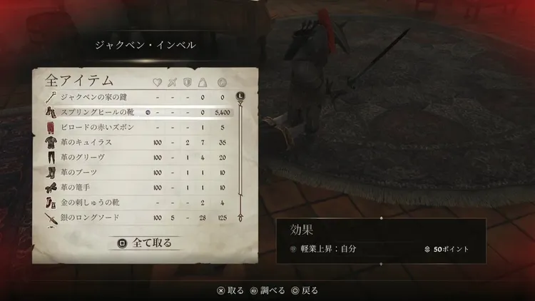 撃破後、遺体から「スプリングヒールの靴」を入手できるので、これを手に入れよう。