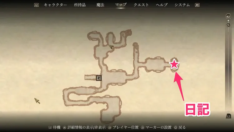 地下墓地の最奥にてスプリングヒール・ジャックの棺を調べて「スプリングヒールの日記」を入手しよう。ルートは画像の通り。
