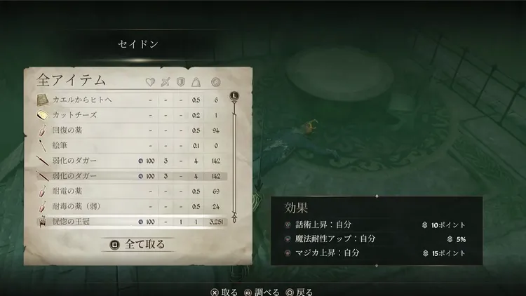 恍惚の王冠 | ・話術上昇(レベル依存) ・魔法耐性アップ(レベル依存) ・マジカ上昇(レベル依存) |
