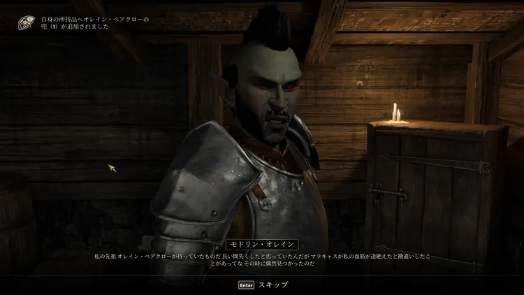 オレインから友情の印として「オレイン・ベアクローの兜(重装)」を入手することができる。