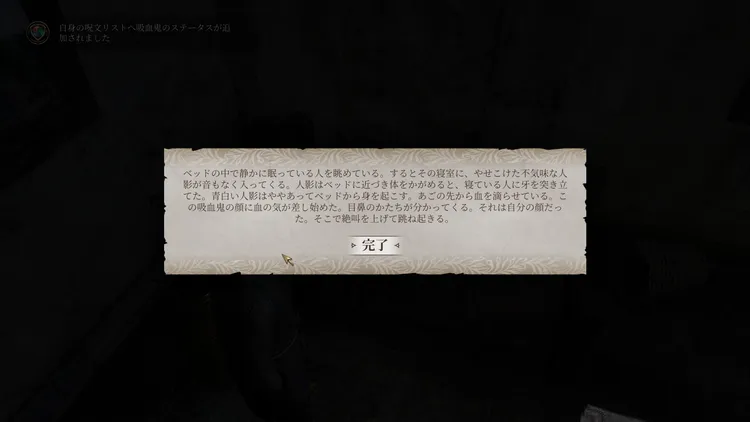 このクエストを最後まで進めると「吸血病の治療薬」を入手することができ、使うことで吸血病に2度と感染しなくなる。