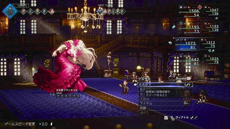 フランセスカ戦は、シュワルツがボスに対して様々なデバフを入れてくれる点と、仲間が弱点を突きやすい点から戦闘自体は比較的楽。