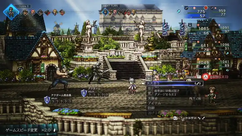 店主に話しかけると、ライバル商店のアクダームとの戦闘に突入する。アクダームのシールド値は8しかないので、先に取り巻きを倒せばブースト連撃で簡単にブレイクを狙えるようになる。