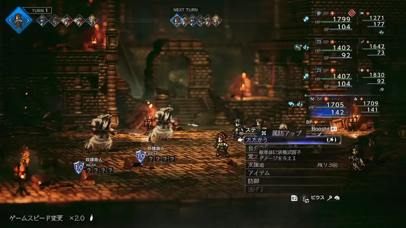 宝箱置き場に近づくと奴隷商人との戦闘が発生する。奴隷商人は2人で出現するが、どちらも同じ弱点かつHPも低いので範囲攻撃でまとめて処理しよう。