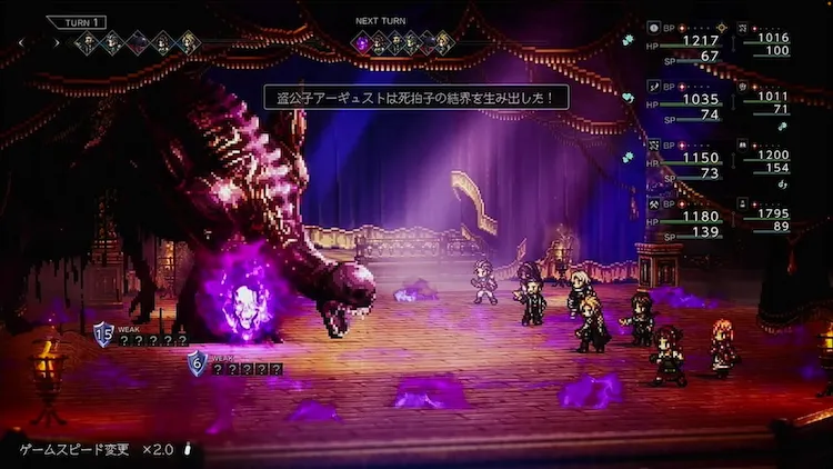 盗公子アーギュストは、最初の行動で「死拍子の結界」を生み出す。「死拍子の結界」は交代しなければカウントが進む死の宣告を前衛に付与する効果がある。