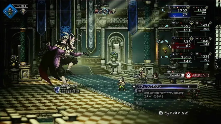 一回の行動で物攻/属攻のどちらも下げることができる「オフェンスダウンの極意」を使うことで、受けるダメージを軽減することができるため、必ず2回以上重ねがけをしてダメージの減少量をあげておこう。