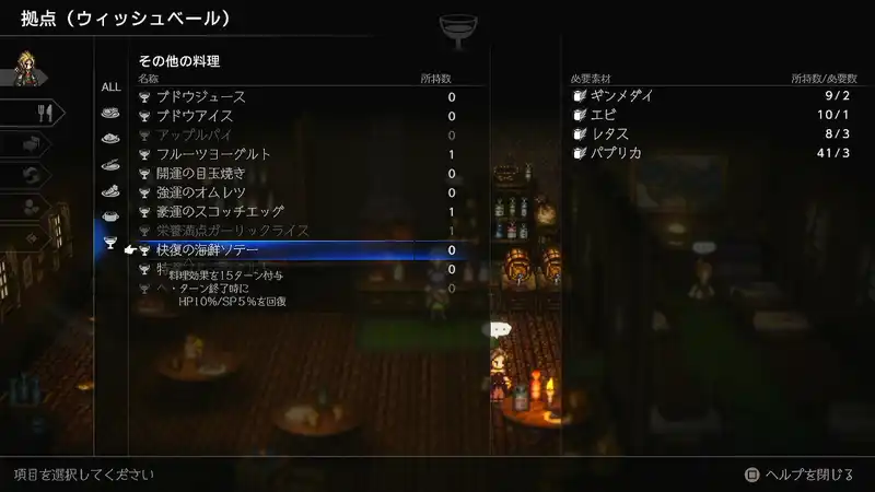 快復の海鮮ソテーは、リプルタイドにいる「トニーの母親」から聞き出すことで作れるようになる。レシピを入手した後、素材を集めてウィッシュベールの酒場で作ろう。