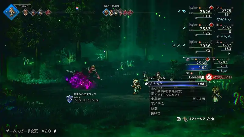 FC「勝ち取る」を使うと血まみれのマフィアとの戦闘になる。血まみれのマフィアは高火力+多段ヒットの前列全体攻撃を仕掛けてくるため、物攻ダウンと物防アップを活用してダメージを軽減しよう。また、シールド値は高いが多段ヒット技が豊富な剣と短剣が弱点となっているので覚えておこう。