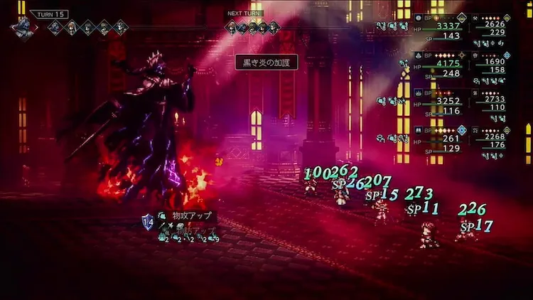 亡者エリカは、後半になると「黒き炎の加護」で攻撃力・防御力が強化され、全体攻撃を多用するようになる。