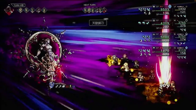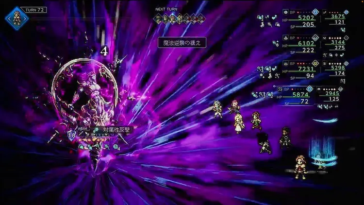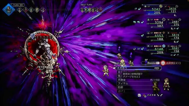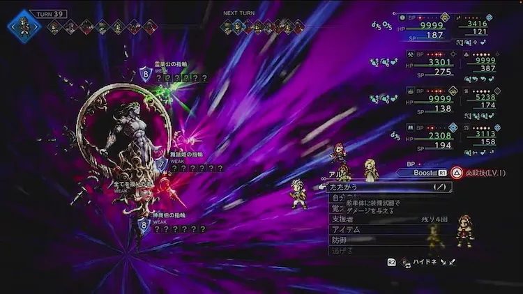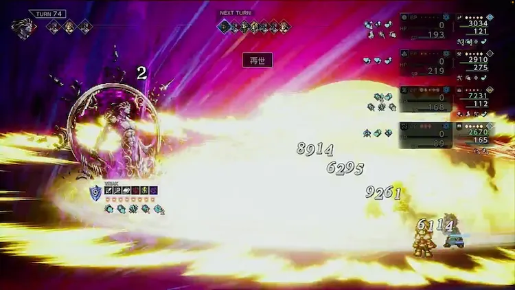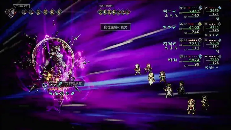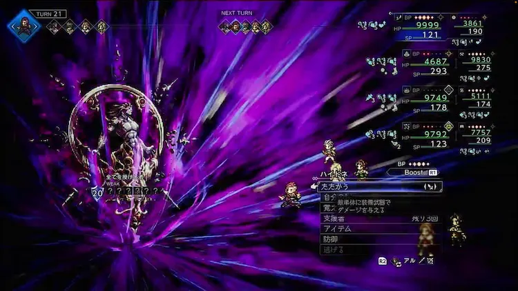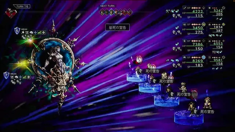 全てを授けし者本体にはBPゲージがあり、BPがMAXになると前衛後衛全体に9999ダメージを与えてくる即死級の攻撃「再世」を撃ってくる。